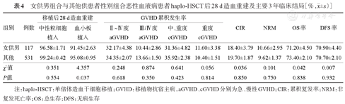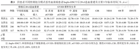 女供男组合与其他供患者性别组合恶性血液病患者haplo-HSCT后28 d造血重建及主要3年临床结局[%,