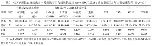 >35岁恶性血液病患者中兄弟供者组与姐妹供者组haplo-HSCT后28 d造血重建及3年主要临床结局比较[%,