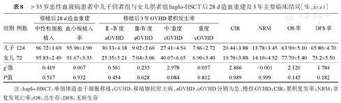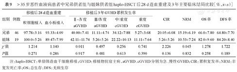 年龄>35岁的患者中,儿子供者组与女儿供者组haplo-HSCT后28 d累积中性粒细胞植入率、血小板植入率差异无统计学意义(P=0.517,P=0.932),Ⅱ~Ⅳ度、Ⅲ/Ⅳ度aGVHD累积发生率及移植后3年OS率、DFS、CIR、NRM率及cGVHD累积发生率差异均无统计学意义(P>0.05),详见表8。兄弟供者组与姐妹供者组haplo-HSCT后28 d累积中性粒细胞植入率、血小板植入率差异无统计学意义(P=0.271,P=0.286),Ⅱ~Ⅳ度、Ⅲ/Ⅳ度aGVHD累积发生率及移植后3年OS率、DFS率、CIR、NRM、cGVHD累积发生率差异均无统计学意义(P>0.05),详见表9。