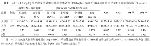 共335例(51.7%)接受rATG-T(总量6 mg/kg)预防GVHD。女供男组和其他组haplo-HSCT后28 d累积中性粒细胞植入率、血小板植入率差异无统计学意义(P=0.631,P=0.404),Ⅱ~Ⅳ度、Ⅲ/Ⅳ度aGVHD累积发生率及移植后3年OS率、DFS、CIR、NRM率及cGVHD累积发生率差异差异均无统计学意义(P>0.05),详见表11。