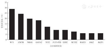 采用二代基因测序共检出32种合并基因突变,其中发生率最高的3种突变基因分别为WT1(28.79%,19/66)、CSF3R(24.24%,16/66)与NRAS(19.70%,13/66)。本组患者未检出NPM1突变。发生率>5%的合并基因突变见图1。