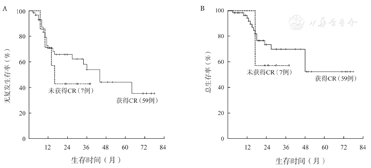 所有患者经1个疗程诱导化疗后,59例(89.39%)获得CR,6例(9.10%)获得PR,1例NR。2个疗程后所有患者均获得CR。中位随访时间为18(4 ~ 78)个月,1、3、5年的RFS率分别为92.0%、62.5%和42.6%,1、3、5年的OS率分别为96.7%、88.7%和50.8%。