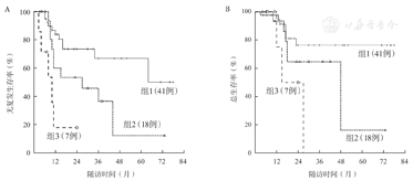 A:三组无复发生存的比较;B:三组总生存的比较。组1:野生型CSF3R且MRD转阴组;组2:突变型CSF3R或MRD阳性组;组3:突变型CSF3R且MRD阳性组