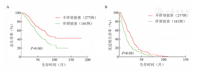 基线伴和不伴肾损害患者的生存分析表明,伴肾损害组和不伴肾损害组中位OS时间(49.2个月对79.7个月,P<0.001)、PFS时间(14.0个月对24.8个月,P<0.001)的差异均有统计学意义(图1)。