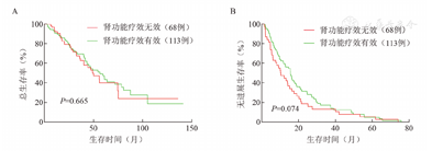 肾功能疗效无效和有效组中位OS时间(47.3个月对56.5个月,P=0.665)、PFS时间(10.2个月对15.6个月,P=0.074)的差异无统计学意义(图2)。