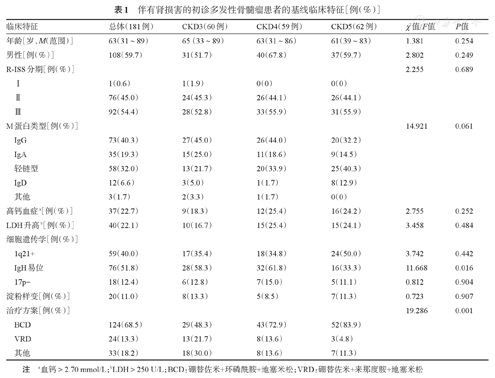 伴有肾损害的初诊多发性骨髓瘤患者的基线临床特征[例(%)]