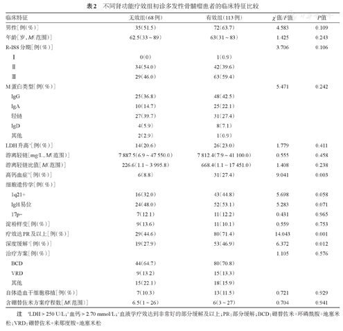 不同肾功能疗效组初诊多发性骨髓瘤患者的临床特征比较