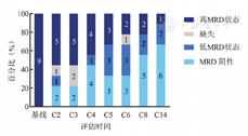 CLL的疗效评估依据中国慢性淋巴细胞白血病/小淋巴细胞淋巴瘤的诊断与治疗指南(2022年版)[10],SLL的疗效评估依据2014版Lugano标准[12],评估总缓解率(ORR)、CR率、不良反应事件(AE)及MRD。AE按照CTCAE 5.0标准分级。MRD阴性定义为多色流式细胞术检测残存白血病细胞<1×10-4[13]。低MRD状态定义为残存白血病细胞≥1×10-4且<1×10-2,高MRD状态定义为残存白血病细胞≥1×10-2。
