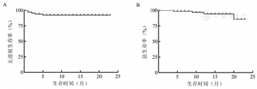 苯达莫司汀中位应用剂量为84.0(66.8~99.5)mg/m2,中位治疗6(1~6)个周期。6例患者停药或更换方案,其中3例患者因发生3~4级AE停药(1例为4级皮疹,1例为4级中性粒细胞减少,1例为肺部感染),2例患者因疾病控制不佳更换方案,1例患者因自身原因停止治疗。63例患者可评估疗效。49例(77.8%)患者获得CR,11例(17.5%)患者获得PR,总有效率(ORR)为95.2%(表1)。中位随访时间14.0(4.0~23.0)个月,中位PFS、OS时间均未达到(图1)。其中FL、MZL和MCL的ORR分别为96.3%、95.7%和80.0%。