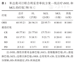 | 疗效 | 总计(63例) | FL(27例) | MZL(23例) | MCL(5例) | 其他(8例) |