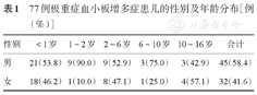 77例极重症血小板增多症患儿的性别及年龄分布[例(%)]