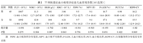 77例极重症血小板增多症患儿血常规参数[M(范围)]