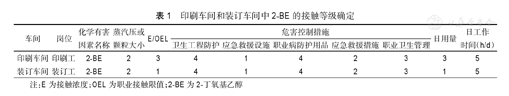平印车间与装订车间是工人接触2-BE的主要工作场所,工作时间10 h/d,每周工作6 d,印刷车间、装订车间空气中2-BE的最高浓度分别为30.8、1.5 mg/m3。印刷车间半定量风险评估参数为0.56[E/OEL=30.8/54.32=0.56,E为接触浓度,OEL职业接触限值],装订车间半定量风险评估参数为0.028[E/OEL=1.5/54.32=0.028],接触等级分别为3和1级。印刷车间和装订车间的接触指数分级见表1。计算接触等级:印刷车间ER≈3,R≈3;装订车间ER≈2,R≈2;前者对应于中等风险,后者对应于低风险,即该企业工作场所空气中浓度最高的印刷车间印刷工对于2-BE的职业健康风险属于中等风险,装订车间烫啤工对于2-BE的职业健康风险属于低风险。