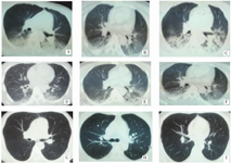 A:2018年5月5日患者1胸部CT;B:2018年5月5日患者2胸部CT;C:2018年5月5日患者3胸部CT;D:2018年5月6日患者1胸部CT;E:2018年5月6日患者2胸部CT);F:2018年5月6日患者3胸部CT;G:2018年5月11日患者1胸部CT;H:2018年5月11日患者2,胸部CT);I:2018年5月11日患者3胸部CT