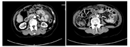 患者2018年5月无明显诱因下出现下腹隐痛,无发热盗汗,无异常阴道流液等不适。于2018年6月20日就诊于当地医院,入院后查CA 125:168.3 U/ml,血常规、生化结果无明显异常。CT检查结果示:大网膜、腹膜增厚浑浊,伴腹水形成(见图1)。2018年7月6日PET-CT结果示:腹腔内大网膜及肠系膜饼状,双附件区增厚,FDG代谢增高,腹盆腔积液,后腹膜、肠系膜间多发小淋巴结。当地医院初诊断为卵巢恶性肿瘤。