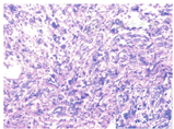 2018年8月8日患者为进一步治疗来我院就诊,入院后查体:T 37.1 ℃、P 101次/min、R 19次/min、Bp 122/73 mmHg,心肺未见异常,腹部稍膨隆,未触及包块,无压痛反跳痛,移动性浊音阳性,神经系统检查未见异常。实验室检查:白细胞8.1×109/L,血红蛋白119 g/L,血小板402×109/L。患者于2018年8月14日在全麻下行卵巢癌根治术,术中查见:大网膜挛缩呈饼状,大小约15 cm×10 cm×4 cm;小网膜、胃表面多发颗粒状肿瘤,部分浸润胃壁肌层;双侧结肠旁沟、小肠系膜、腹壁腹膜散在粟粒样结节;双侧卵巢肿瘤,大小约3 cm×1 cm×1 cm,与直肠前壁分界不清,双侧输卵管挛缩。术后病理结果显示:左、右卵巢表面,腹膜内见恶性肿瘤,结合形态及免疫组化,符合上皮样恶性间皮瘤(图2)。免疫组化结果:CR/Calretinin(+)、D2-40(+)、WT-1(+)、CK5/6(部分+)、CEA(-)、Napsin A(-)、Ki-67(+,30%)、CK7(+)、ER(-)、PR(-)、P53(部分+)、P16(-)、PAX2(-)、Bob.1(-)、PLAP(-)、Ber-EP4(-)、HBME-1(+)、EMA(-)、PAX-8(-)。术后予以6周期培美曲塞+卡铂辅助化疗。
