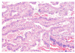 患者2019年5月29日胸部CT检查发现右肺下叶占位,大小约2.26 cm×2.13 cm(图3)。经我院MDT团队讨论,综合病史,首先考虑患者为肺部第二原发肿瘤,全面评估后认为患者具有手术指征。遂于2019年7月3日在全麻下行右肺癌根治术(右下肺切除+系统性淋巴结清扫术)。术后病理结果示:(右下)肺结节型(瘤体2 cm×2 cm×1.8 cm)浸润性腺癌(腺泡为主型,部分区呈乳头状生长),淋巴结阴性(见图4)。术后分期为pT1bN0M0 Ⅰ期。免疫组化:ROS1(-)、c-Met(++,约占60%)、NapsinA(+)、TTF-1(+)、CK5/6(-)、P40(-)、P63(少量+)、CK7(+)。目前患者定期复查,疾病基本维持稳定。