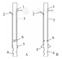 A:内囊充气状态;B:外囊充气状态;1:洗胃管主体;2:外气囊充气腔;3:内气囊充气腔;4:流食孔;5:外气囊;6:内气囊