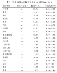 541种有机溶剂样品中116种未检出挥发性有机组分,425种有机溶剂中检出挥发性有机组分201种,累计检出2 265项次,其中烷烃类、含苯化合物及醇类的检出频次高。见表1。检出率排在前5位的依次为二甲苯(29.76%)、甲苯(21.81%)、甲醇(20.70%)、正己烷(14.79%)和乙苯(14.23%)。见表2。