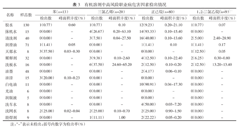 541份有机溶剂样品中检出含苯样品13份,峰面积丰度0.02%~0.60%,其中峰面积丰度最高的是某企业使用的"胶水";检出含三氯乙烯样品20份,峰面积丰度0.04%~65.20%,其中峰面积丰度最高的是某企业使用的"洗板水";检出含正己烷样品80份,峰面积丰度0.03%~22.40%,其中峰面积丰度最高的是某企业使用的"稀释剂";检出含1,2-二氯乙烷样品9份,峰面积丰度0.05%~28.90%,其中峰面积丰度最高的是某企业使用的"无铅环保清洗剂"。常见有机溶剂中苯检出率较高的包括天那水、洗网水、油漆等,三氯乙烯检出率较高的包括抹机水、清洗剂、稀释剂、洗网水等,正己烷检出率较高的包括抹机水、白电油、清洗剂、洗车水、胶水等,1,2-二氯乙烷检出率较高的包括洗板水、稀释剂、清洗剂等。见表3。