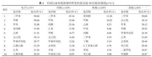 不同行业有机溶剂中挥发性组分前10位检出情况[n(%)]
