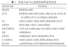 GBZ 188-2014《职业健康监护技术规范》[1](以下简称"规范")自2014年10月1日起正式实施,在职业禁忌证筛查、职业病的一级和二级预防方面发挥了关键作用,对职业健康监护的规范化和法治化、保护劳动者健康起到了积极作用[2]。但我们在职业健康体检的使用过程中,发现职业禁忌证关于心血管疾病方面因各体检机构理解的差异导致使用上存在非"同质化",存在部分职业禁忌证的体检结论扩大化现象。目前规范中职业禁忌证中的心血管疾病主要涉及器质性心脏病、心律失常、高血压等,作业内容涉及化学物、物理因素、特殊作业等(见表1)。这种职业禁忌证结论阳性扩大的原因源于心血管疾病的复杂性。如心脏超声心动图未见明显异常时,心电图的ST-T改变是否可定义为器质性心脏病、"各种心律失常"中涵盖的如窦性心动过缓、窦性心动过速等列入是否范围过大、功能性与器质性室性早搏(简称室早)是否需进一步区别、高血压所定义的"未控制的高血压"如何理解和量化等。本文就上述常见问题作一探讨。