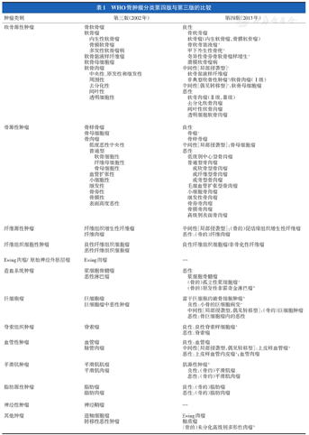 2002年,世界卫生组织(World Health Organization,WHO)出版了第三版《WHO骨与软组织肿瘤分类》[1],之后该书成为骨与软组织肿瘤相关从业人员的重要参考书。11年后,国际癌症研究机构(International Agency for Research on Cancer,IARC)于2013年出版了由Fletcher等四位教授担任主编、来自20余个国家147位专家修订的《WHO骨与软组织肿瘤分类》第四版[2]。新版的WHO分类充分体现了十余年来骨与软组织原发性肿瘤和瘤样病损在临床、病理、分子生物学和预后等多方面的研究进展,强调根据肿瘤的生物学行为进行分类,融入了近年来对肿瘤及其分类概念性认识的变迁和更新[3,4,5,6]。本文通过学习和解读新版骨肿瘤分类,着重介绍新增加的肿瘤病种以及新旧两个分类版本的差异(表1)。
