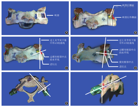关于下颈椎,综合各置钉方法的优、缺点,确定其研究(C3~C7局部解剖定位法)的指导思想[12,13]:①寻找下颈椎(解剖结构)本身干扰因素最小的参照系;②与胸、腰椎椎弓根进钉点上、下位置(即横突根部上、下缘)的确定需要横突参与一样,颈椎椎弓根进钉点位置的确定也与横突有关,在学习过程中具有系统性和连贯性,易于理解和掌握。为此,我们引入"峡部"概念,即某下颈椎的"峡部"即为该节段上关节突下缘、下关节突上缘在侧块上的垂直投影与该节段上关节突内、外侧缘纵行切线所围成的侧块区域。其特点是除了外伤或病理侵害外,其不受关节突增生、颈椎体位及本身位置变化的影响,较为恒定。"峡部"中外1/3的垂线与过横突根部中点水平线的交叉点即为进钉点。在应用解剖学研究中,此点确实是该节段椎弓根中轴线在侧块上的投影。椎弓根中轴线与"峡部"后侧面和后外侧面所形成的纵向角、横向角就某一颈椎而言是固定的、理论上能够达到精准置钉的目的。在实际应用中,就某一患者应用颈椎三维CT工作站系统来进一步矫正,该工作亦进入后期总结中,已达到个性化的要求。此方法在置钉过程中无需X线透视监测,略有不足的是:①术中开路过程用力较大;②椎弓根无"芯"者不能应用此方法。
