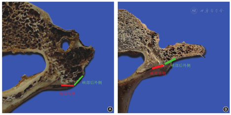 我们提出了C3~C7"峡部"的概念,即取经过"峡部"中外1/3的垂线与横突根部中点的水平线相交,交点为螺钉的进钉点;定义椎弓根中轴线在水平面上与峡部后外侧面形成的夹角为横向角;椎弓根中轴线在矢状面上与峡部后侧面形成的夹角为纵向角。在C3~C5取横向角分别为95.10°±3.96°、86.60°±3.35°、84.60°±4.95°;纵向角分别为71.25°±4.54°、69.90°±5.06°、76.15°±5.11°(图1)。在C6、C7置钉中,根据椎体峡部后侧面与峡部后外侧面有时会出现成角分为两类,当两者为同一平面时取横向角为59.71°±1.10°,选取纵向角为75.86°±1.12°;当两者有成角时取横向角89.61°±1.24°,选取纵向角为75.86°±1.12°(图2)。