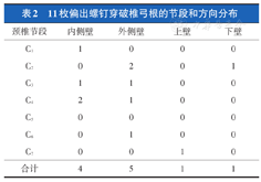 本研究中置钉的准确率为97.79%(0级),且所有随访患者术中及术后均未出现脊髓、神经根及血管损伤等;随访期间亦未见内固定物松动、断裂现象,且骨愈合良好,表明该置钉方法比较精准。不过术后CT三维重建仍提示有11枚螺钉穿破椎弓根骨皮质,但其中误置仅为3枚(Ⅱ级);在节段分布上,11枚螺钉中穿破C3、C4节段椎弓根5枚(45.5%)。国内外研究表明,C3、C4椎弓根宽度较小(尤以亚洲人明显),横向角较大,此外若术中显露不充分,加上两侧肌肉及切口的阻挡,使得C3、C4节段置钉难度明显增大,增加螺钉穿破椎弓根骨皮质的风险;在穿破方向分布上,11枚中突破椎弓根内侧壁4枚(36.3%),外侧壁5枚(45.5%),上壁及下壁各1枚(占9.1%)[10,12,13,23,24]。