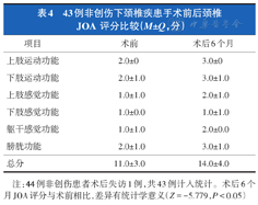 非创伤患者44例,失访1例,共43例计入统计。术后6个月进行JOA评分,JOA评分改善率优7例、良20例、可8例、差8例,平均为42.3%。术后6个月JOA评分与术前比较,差异有统计学意义(P<0.05,表4)。