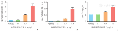 使用免疫健全的BAL B/C小鼠建立鼠骨肉瘤模型,测试去甲基化对自发肿瘤免疫反应的影响,流式细胞仪分析肿瘤浸润淋巴细胞的状况发现,对照组肿瘤内浸润的CD3+淋巴细胞数量极少,其中的CD8+ T细胞在所有细胞中的比例低至0.2%左右。CD8+ T细胞比例随着DAC治疗剂量的提高而升高,其中1.0 μg/g组小鼠肿瘤浸润CD8+ T细胞在所有细胞中的比例达到最高,平均约为3.0%,是对照组的15倍,差异有统计学意义(P<0.05,图1)。
