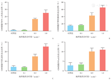 两周后将20只成瘤小鼠分成4组,分别为对照组,DAC治疗量为0.1 μg/g、0.5 μg/g和1.0 μg/g治疗组。DAC以0.1~1.0 μg/g体重的剂量进行腹腔注射,在注射肿瘤两周后开始进行,每日一次,治疗两周后将所有小鼠安乐死,将荷瘤下肢进行截肢、称重。随后剥离肿瘤组织,将肿瘤组织用刀片切碎后在裂解液(0.2 mg/ml的胶原酶Ⅳ,0.1 mg/ml的透明质酸酶,0.1 mg/ml的DNA酶,0.2 mg/ml的BSA溶解于DMEM培养基中)中37 ℃孵育1 h,随后经70 μm过滤器获取细胞用于流式细胞仪检测。