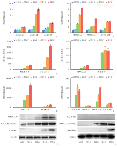 U2OS本来就表达少量的MAGE-A家族蛋白,亦能从DAC治疗中得到显著收益(图3A,图3B,图3C,图3G)。HOS在治疗前不表达任何被检测的CTA,在DAC治疗3 d后MAGE-A家族开始表达,7 d后NY-ESO-1开始表达,但MAGE-A10始终不表达(图3)。