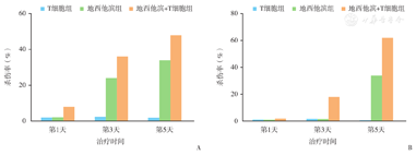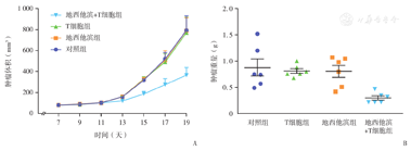 分析肿瘤体积的数据,联合组自17 d开始与其余3组比较的差异有统计学意义(联合组vs.对照组,P=0.039),在第19天时与对照组比较有统计学意义(P=0.012)。分析肿瘤重量数据,联合组与对照组、T细胞单用组、DAC单用组的差异均具有统计学意义(P<0.05)。