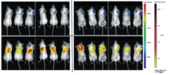 在免疫缺陷NOD-SCID小鼠中建立人源骨肉瘤移植瘤模型,验证去甲基化预治疗对CTA特异性CD8+ T细胞输注的作用。通过小动物活体成像系统发现,在未经DAC预处理的小鼠,T细胞主要分布于肝、肺等器官,肿瘤组织未见T细胞信号;经DAC预处理的小鼠中,T细胞能归巢到肿瘤组织(图6)。