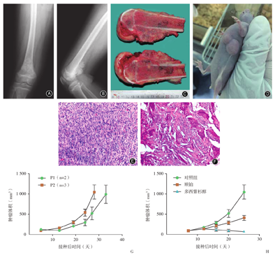 本研究中,将骨与软组织肉瘤患者肿瘤接种于裸鼠皮下,总体成瘤率45.2%,其中骨肉瘤37.5%,并发现骨与软组织肉瘤PDX模型接种的成功率与病理类型存在一定的相关性。在其他类型肿瘤中,将肺癌患者的肿瘤组织接种到免疫缺陷的裸鼠皮下,成瘤率24.5%[8]。在高级别肉瘤中,Stebbing等[9]将29例肿瘤接种于裸鼠,22例成瘤,成瘤率76%。另有报道显示在一组胃癌病例中接种成功率为34.1%(63/185)[10]。成功的建模为进一步个体化治疗提供了基础,也为生物靶点的研究提供了支持,我们建立的PDX模型也将为患者的药物筛选及进一步的科研提供有效的工具和前提。