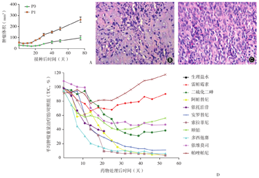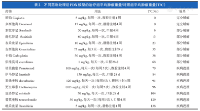 根据化疗药物的临床使用指南中的方案,并按化疗药物小鼠/人剂量换算分别定期给予每组小鼠化疗药物,定期测量小鼠肿瘤最长径和最短径,计算小鼠肿瘤体积:V=最长径×最短径2/2[7]。比较各组肿瘤生长情况,并通过治疗组平均肿瘤重量/对照组平均肿瘤重量(T/C)计算抑制率,得出敏感药物和非敏感药物。