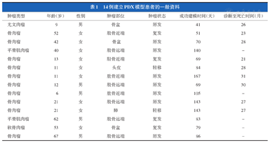 建立恶性骨与软组织肉瘤患者来源移植瘤模型(patient-derived xenograft,PDX)模型并统计其建模的成功率,观察PDX化疗反应与临床的符合率,以为筛选敏感二、三线药物提供理论基础。