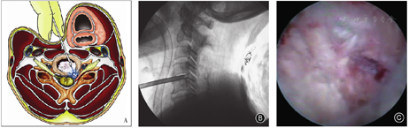 颈椎后路经皮内镜利用传统的钥匙孔(keyhole)手术原理在椎板间隙外侧和关节突内侧交界处的"V"点开窗,主要用于摘除外侧型椎间盘突出和椎间孔狭窄的局部减压。颈椎前路经皮内镜通过内脏鞘和血管鞘之间穿刺,需经椎间盘置管到达后侧突出部位才能解除后侧的突出和压迫,但通过椎间盘操作会加速椎间盘退变,其远期效果尚待研究。由于颈椎毗邻脊髓、颈部血管、椎动脉、食管、气管等重要结构,颈椎椎间孔和椎板间隙狭小,经皮内镜工作套管难以经过自然间隙进入,而且颈脊髓为中枢神经,耐受性差,不能像在腰椎那样通过牵拉、推移造成操作空间,经皮内镜在穿刺置管、镜下操作各个环节均可能引起严重并发症,手术风险相对较大。Choi等[5]建议局部麻醉下操作,以便及时观察患者反馈以降低误伤的风险。但也学者采用全身麻醉,避免患者的紧张和不适。