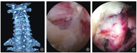 后路经皮内镜穿刺置管时有进入椎板间隙损伤脊髓的风险,需要X线透视定位穿刺点及方向,穿刺、扩张和置管均要抵达椎板和关节突骨质,避免进入椎板间隙。开窗和减压过程中也有损伤神经的风险,在内镜下清晰显露"V"点后应用金刚砂磨钻磨除骨质,要牢固控制磨钻方向和深度,平移摆动磨钻磨除骨质,避免下压磨头,以免损伤神经,椎板磨薄后可用内镜下枪钳咬除。开窗后切除黄韧带外缘的韧带,显露硬膜囊外缘,沿硬膜囊外缘延续部显露神经根,探查、摘除脊髓外侧突出的髓核(图2)。Yang等[8]报告42例后路经皮内镜手术病例,其中1例术后发生对侧下肢神经功能障碍,考虑与术中牵动脊髓有关,经保守治疗3个月好转;1例椎间盘突出巨大,并被脊髓包绕难以分离,改行前路颈椎间盘切除融合术(anterior cervical discectomy fusion, ACDF)。因此,应选择合适的适应证,避免过度牵拉脊髓和神经。