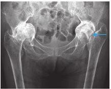女,64岁,十余天前屈髋拾物时出现左髋疼痛和异响。既往有38年类风湿关节炎病史,病程中逐渐出现双膝关节、双髋关节、双手关节疼痛及畸形,规律口服抗类风湿药物,病情稳定。此次入院前13年曾在全身麻醉下接受双膝关节置换术,术后膝关节活动范围良好,假体位置理想。