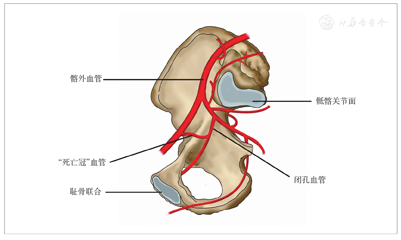 "死亡冠"血管广泛存在,Stoppa入路下发现该血管的发生率约为88.5%。在临床治疗骨盆、髋臼骨折显露耻骨支时需注意仔细分离"死亡冠"血管,尤其采用髂腹股沟入路时更需谨慎,以免损伤引起大出血。