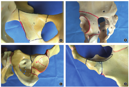 患者术前的影像学资料(X线片、平扫及三维CT)作为直接的研究对象。这些数据均由医学影像信息系统(Picture Archiving and Communication Systems,PACS)导出并存储于个人电脑中。此外,1位健康志愿者(男,35岁)的3D打印骨盆模型作为髋臼解剖学研究对象。手术入路由手术记录和术后X线片上的皮肤钉共同确认,确保准确无误。