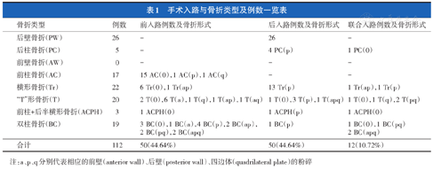 | 骨折类型 | 例数 | 前入路例数及骨折形式 | 后入路例数及骨折形式 | 联合入路例数及骨折形式 |