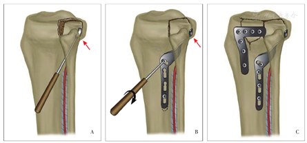 通过骨间膜卵圆裂孔处,紧贴上胫腓关节下方沿胫骨平台外侧采用微型骨膜起子骨膜下剥离至胫骨平台后外侧,向前上方顶起后外侧平台骨折块(图3A),可通过前外侧关节间隙观察复位情况,必要时克氏针临时固定,同时为旋转支撑接骨板置入建立了软组织通道,操作时紧贴骨膜下进行,以防损伤后方重要血管神经。