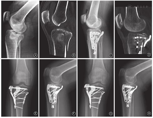 术后行膝关节CT检查,观察骨折复位及固定情况,术后6、12、24周、1年分别复查膝关节X线片,记录膝关节活动度。