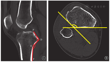 前期研究依据Kuwano等[10]报告的方法建立胫骨平台坐标体系,测量了上胫腓关节下方胫骨后外侧骨皮质长轴间夹角(∠C)、后外侧平台斜坡角(∠PDE)、后外侧斜坡骨干角(∠DEF)三项角度指标(图6)。我们根据这些数据设计了符合胫骨后外侧平台解剖形态的旋转支撑接骨板,获得了中国发明专利(中国专利号:CN104706413A)。