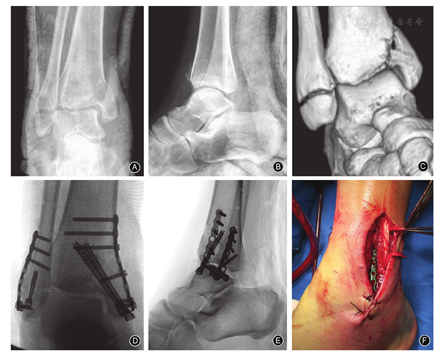 入院后予冰敷、抬高患肢、活血消肿、止痛等对症治疗,同时进一步行CT及三维重建检查,结果显示右外踝骨折、内踝粉碎性骨折(图1C)。根据Lauge-Hansen踝关节骨折分型为旋后内收型,AO/OTA分型为44-A2型。