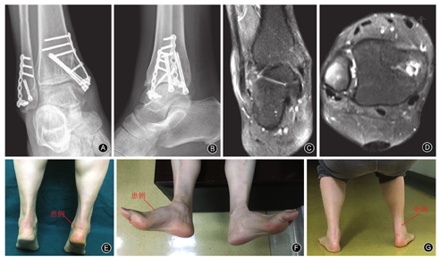 术后予头孢呋辛预防感染治疗3 d。术后2周伤口拆线;术后1个月拆除石膏,穿步行靴部分负重行走,允许患者踝关节背伸、跖屈锻炼,避免内翻、外翻活动;术后3个月全负重行走,恢复顺利。术后15个月复查右侧踝关节正、侧位X线片示骨折愈合良好,踝关节间隙正常(图2A,图2B)。患者日常活动不受限,行走活动时稍有僵硬不适,剧烈活动后稍有疼痛,美国足踝外科协会(American Orthopaedic Foot and Ankle Society,AOFAS)评分为92分。术后2年余复查右踝MRI示腓骨短肌腱连续性存在,冠状位及横断位可见轻微水肿高信号(图2C,图2D)。体格检查示双足提踵试验阴性(图2E),右足背伸、内翻、外翻活动度正常,与健侧相同(图2F),右足外翻肌力Ⅴ级,与健侧相同;患者下蹲不受限(图2G)。患者已恢复爬山运动,AOFAS评分为100分。